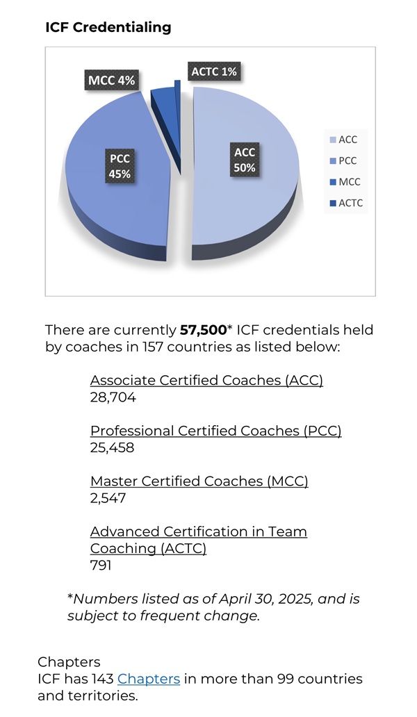 截至2025年5月14日,在全球157个国家和地区里,有57500名教练持有ICF认证教练证书。其中——