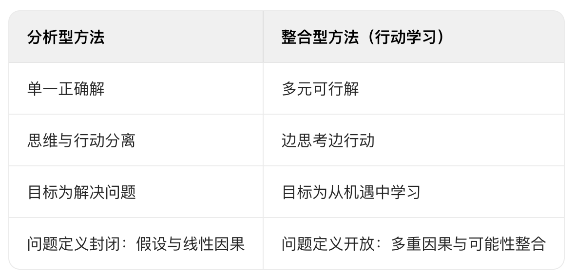 典型的行动学习团队由不同领域、背景和专业的成员组成:多样性越高,提问质量与解决方案有效性越强。不少来自质量 / 流程部门、熟悉石川图、MASP、六西格玛等分析工具的专业人士,在接触行动学习后,发现其作为整合型方法论的价值 —— 既能强化其他工具的效能,又能独立发挥作用。
