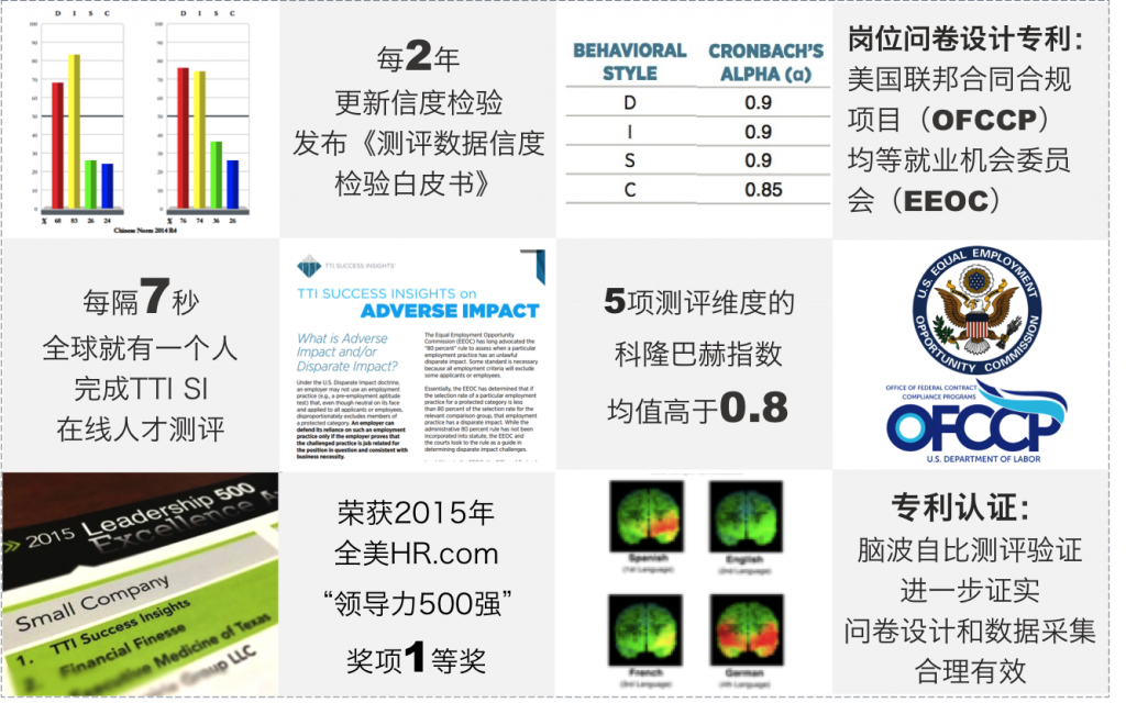 TTI SI的强项在于不断验证并证明人才测评的科key data学依据, 通过美国专属研究院的脑波检测,验证问卷设计和数据采集的可靠性和有效性,使得报告衡量心理学测评信度可靠性的科隆巴赫指数均值达到0.8以上(一般被业界专家认为该指数在0.6-0.7之间的心理学测评报告为可靠数据),脑波检测的问卷有效性已获得美国专利认证。