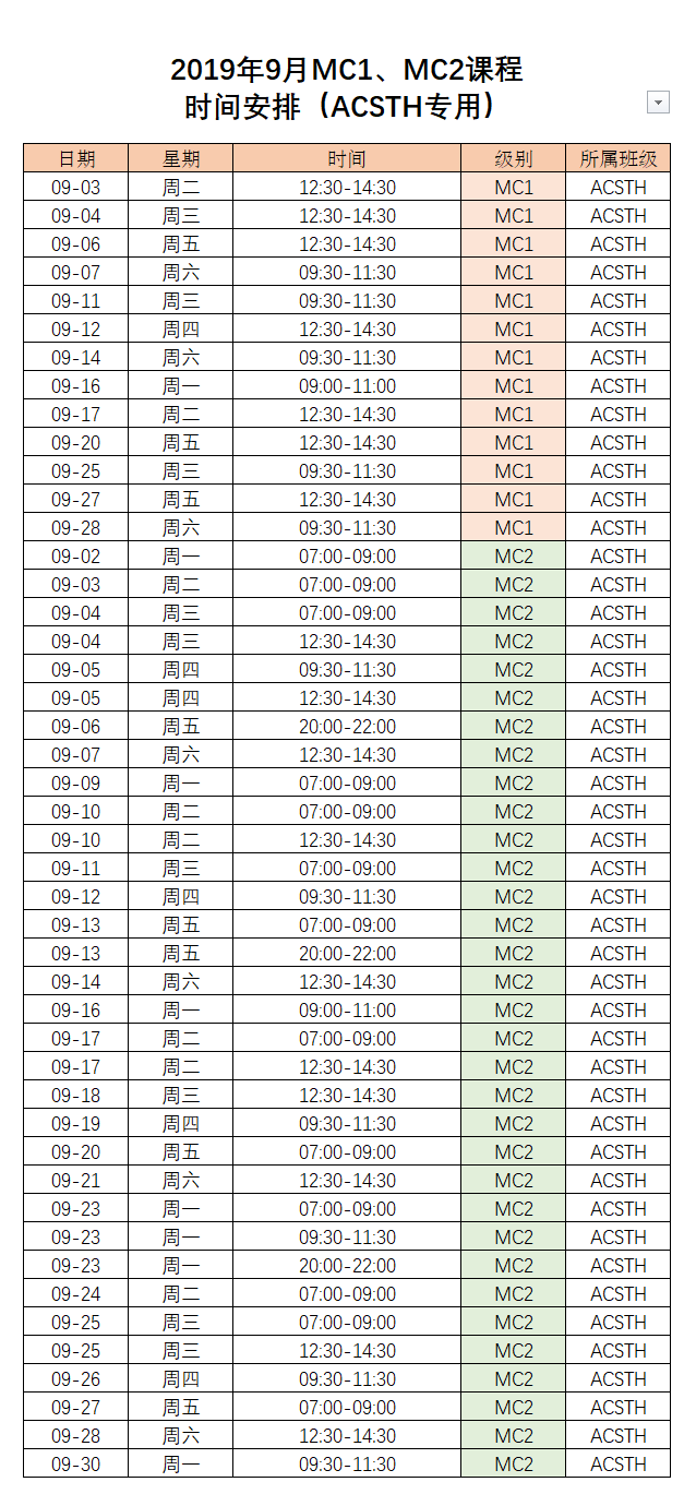 2019年9月MC1、MC2课程时间安排表(ACSTH专用)