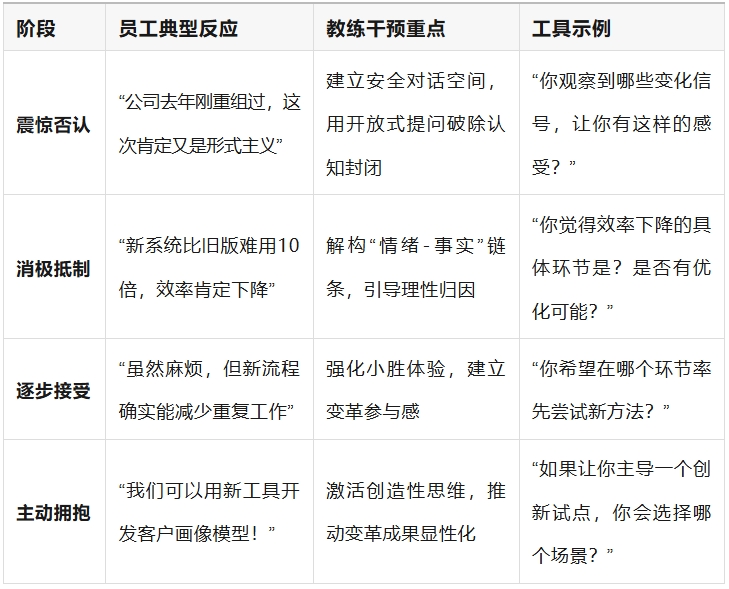 根据库伯勒 - 罗斯变革曲线,员工面对变革会经历四个心理阶段,教练需匹配不同引导策略: