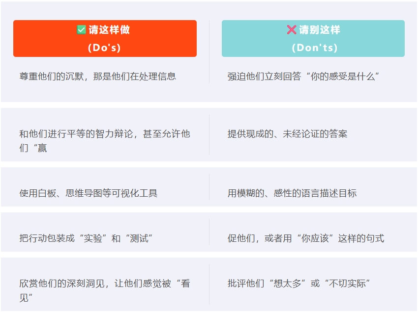 为何有效:用“认知收获”和“系统升级”来总结,完全契合他们的价值体系。这让他们感觉到,教练是一次富有成效的智力探索,而不是一次情感上的审问。