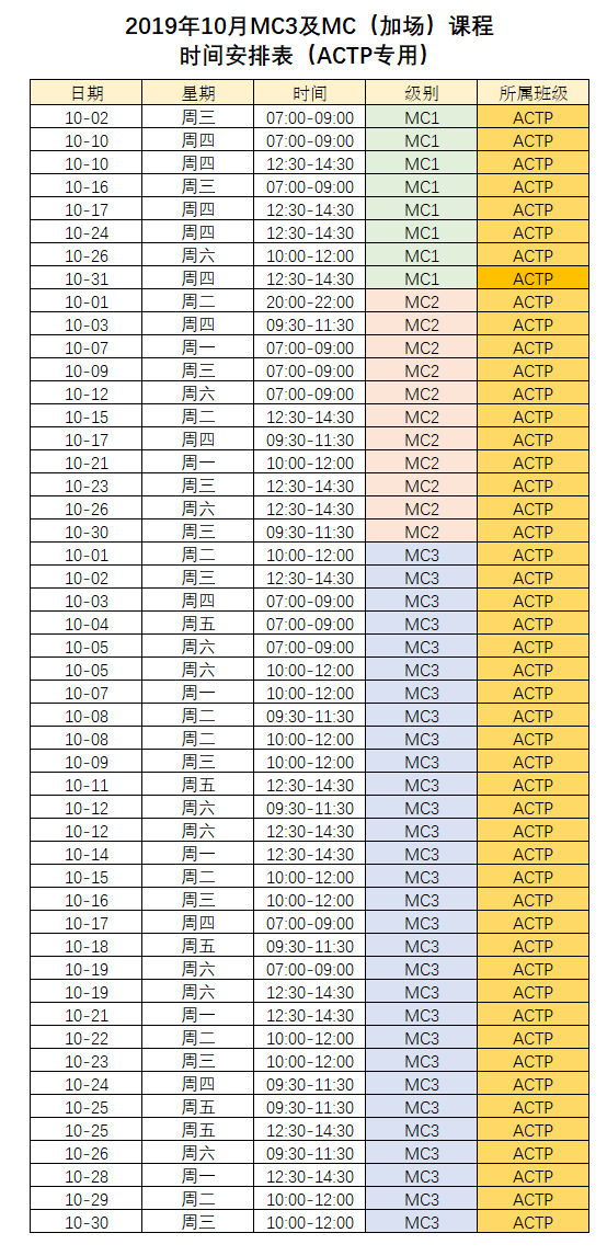 2019年10月MC3及MC(加场)课程时间安排表(ACTP专用)