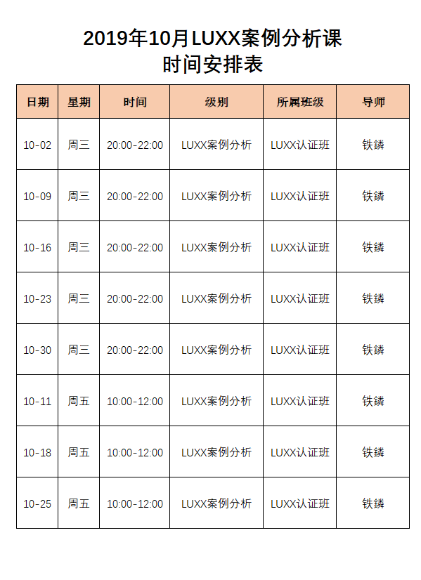 2019年10月 LUXX分析师案例分析课时间表