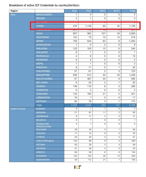 截至2025年8月31日,ICF统计中国大陆地区教练持证人数为1738人,香港地区391人,台湾地区280人。