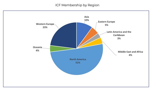 ICF在156个国家和地区拥有58066个会员,在99个国家和地区拥有超过143个分会。