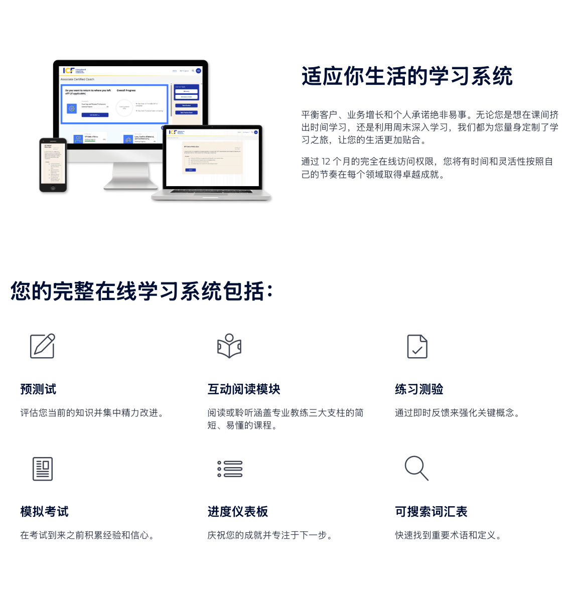 基于ICF COACHBOCK™,由了解您职业发展历程的教练专家精心打造,这不仅仅是备考,更是职业转型的助力。我们全面的在线学习系统,助您在专业教练的三大支柱领域脱颖而出,同时通过真正理解您的技能,建立深厚的自信。
