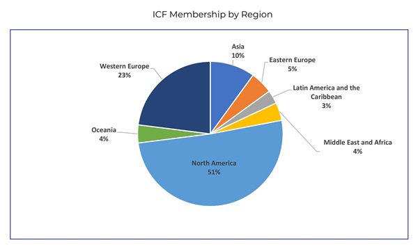 ICF在153个国家和地区拥有57331个会员,在99个国家和地区拥有超过143个分会。