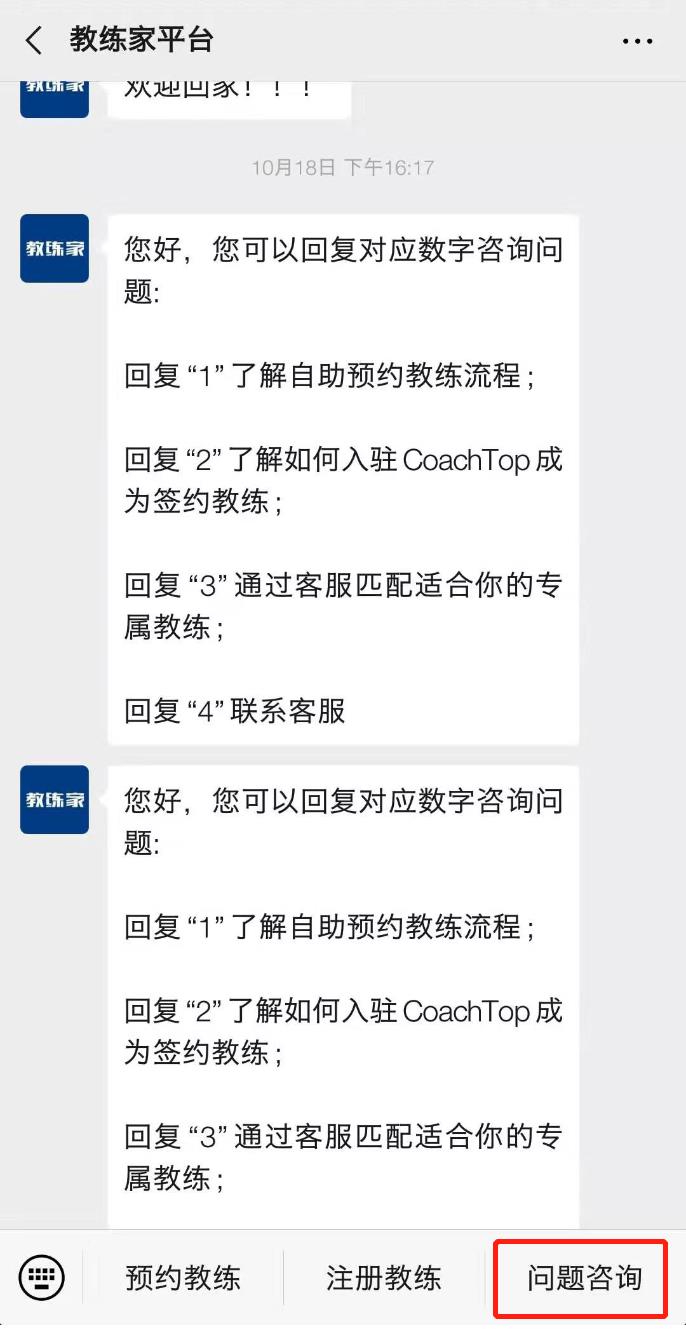 5、 你也可以回到公众号首页点击【问题咨询】联系客服帮你匹配适合的教练