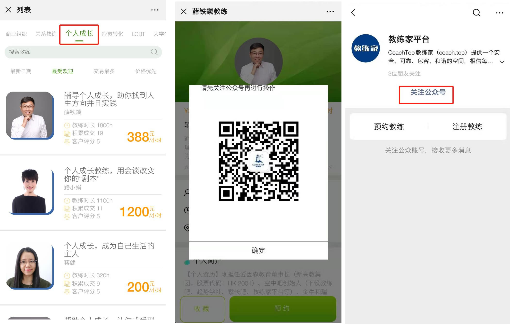 1、 已经接到邀请链接的客户,打开后是教练的个人主页,点击预约弹出【公众号关注提醒】,识别图中二维码并关注公众号,再重新打开邀请链接进行【预约】,预约流程请参考下方(备注:老用户请跳过此步)