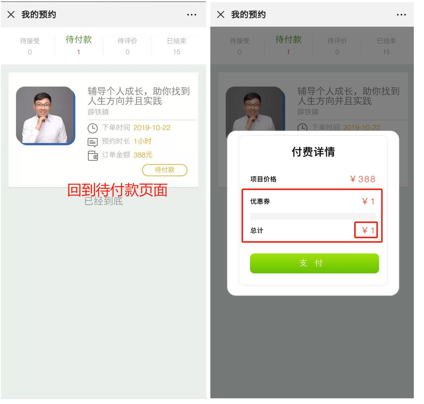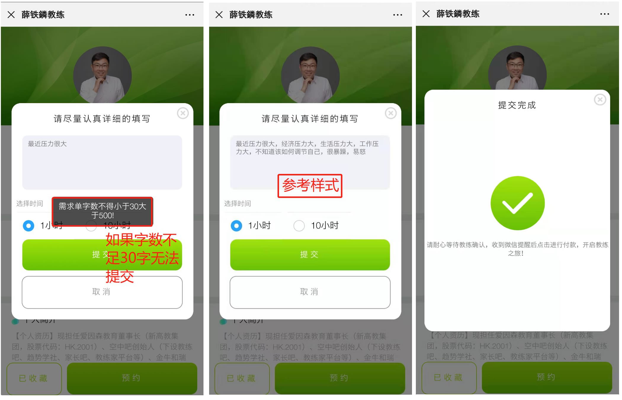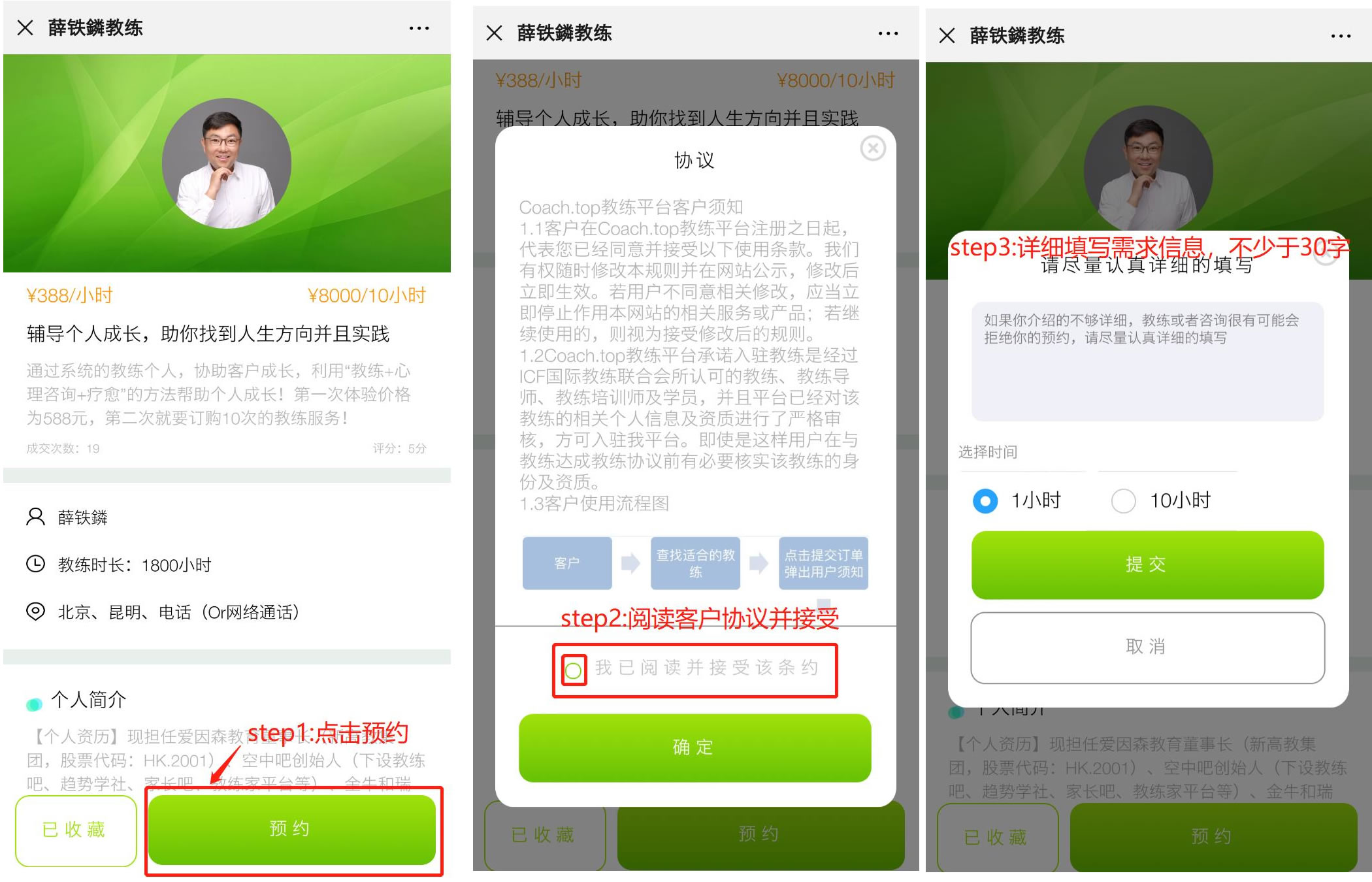 1、【预约】后等待教练确认(备注:根据您的需求填写情况教练会直接确认或先联系您了解更多的信息决定接受或拒绝),教练确认后会收到微信提醒【付款】