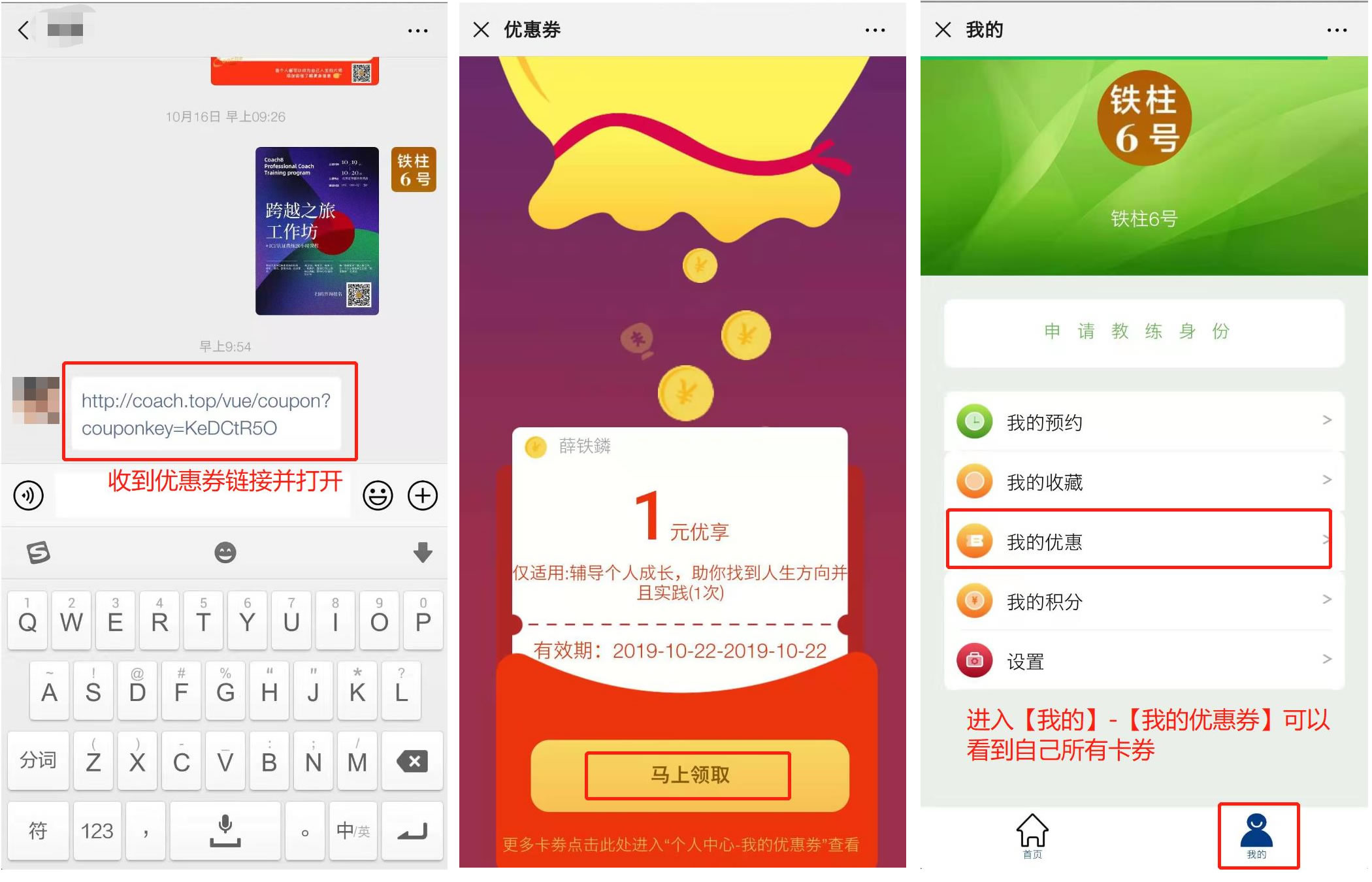 2、使用【优惠券】付款;如果先接到优惠券链接,可直接通过【我的优惠】使用优惠券预约