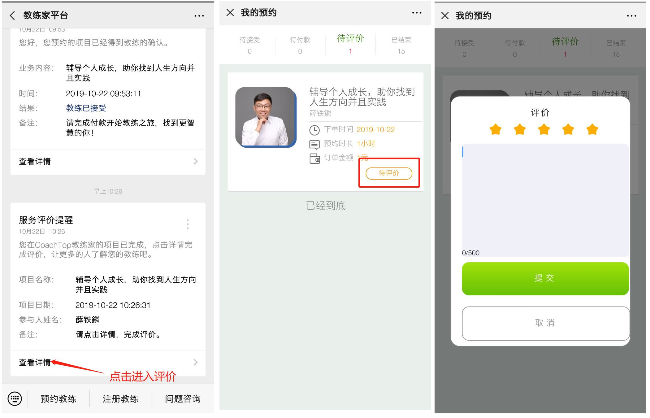 第六步,评价:约谈结束后教练会发送通知确认订单已经完成并邀请【评价】。 约谈结束后10天未进行评价,系统会默认评价。