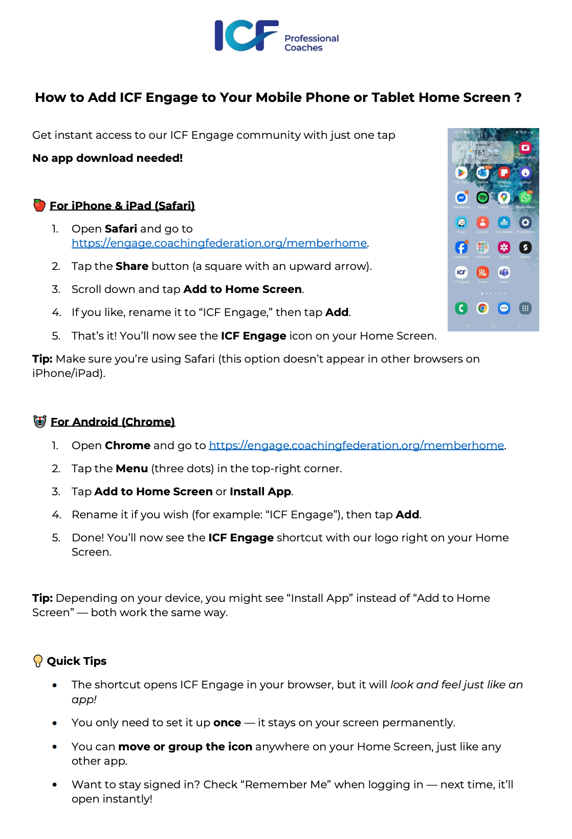 一次点击,随时随地连接。通过我们的分步指南,您将学会如何将 ICF Engage 添加到手机或平板电脑的主屏幕,无需下载应用,即可一键访问我们的教练社区。
