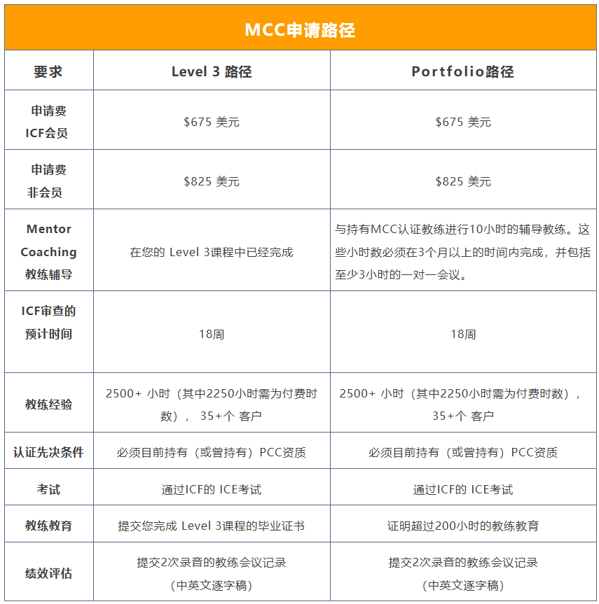 申请条件:申请人必须首先是持有有效的ICF证书(ACC、PCC或MCC)。