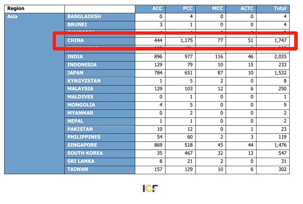 截至2025年11月30日,ICF统计中国大陆地区教练持证人数为1747人,香港地区397人,台湾地区302人。