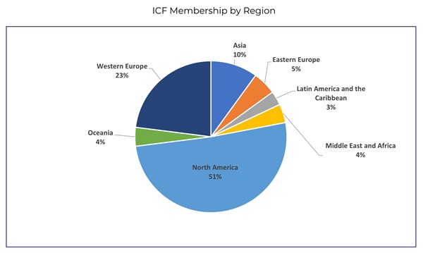 ICF在156个国家和地区拥有58743个会员,在99个国家和地区拥有超过143个分会。