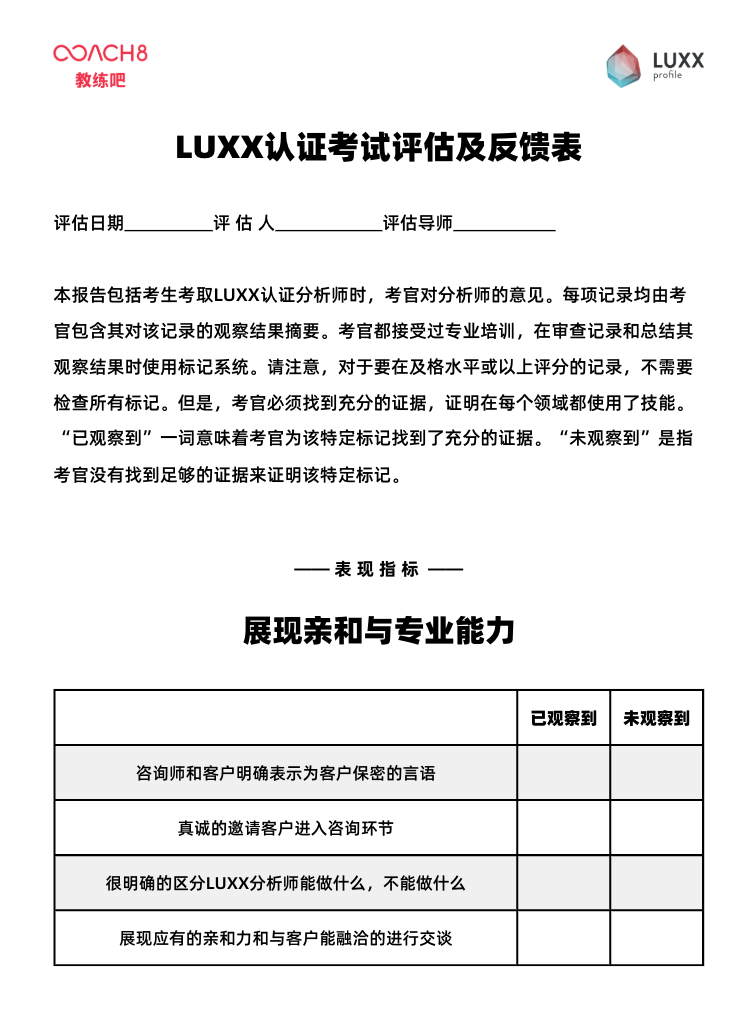 LUXX Profile中国分析师的考核中,导师会以寻找考生具备的能力为准(不会聚焦问题,更多的是聚焦考生的已有能力)。另外,考生要以一种积极正向的方式解读客户的图谱,考核中考官会很注意考生讲述中是否带有评判。