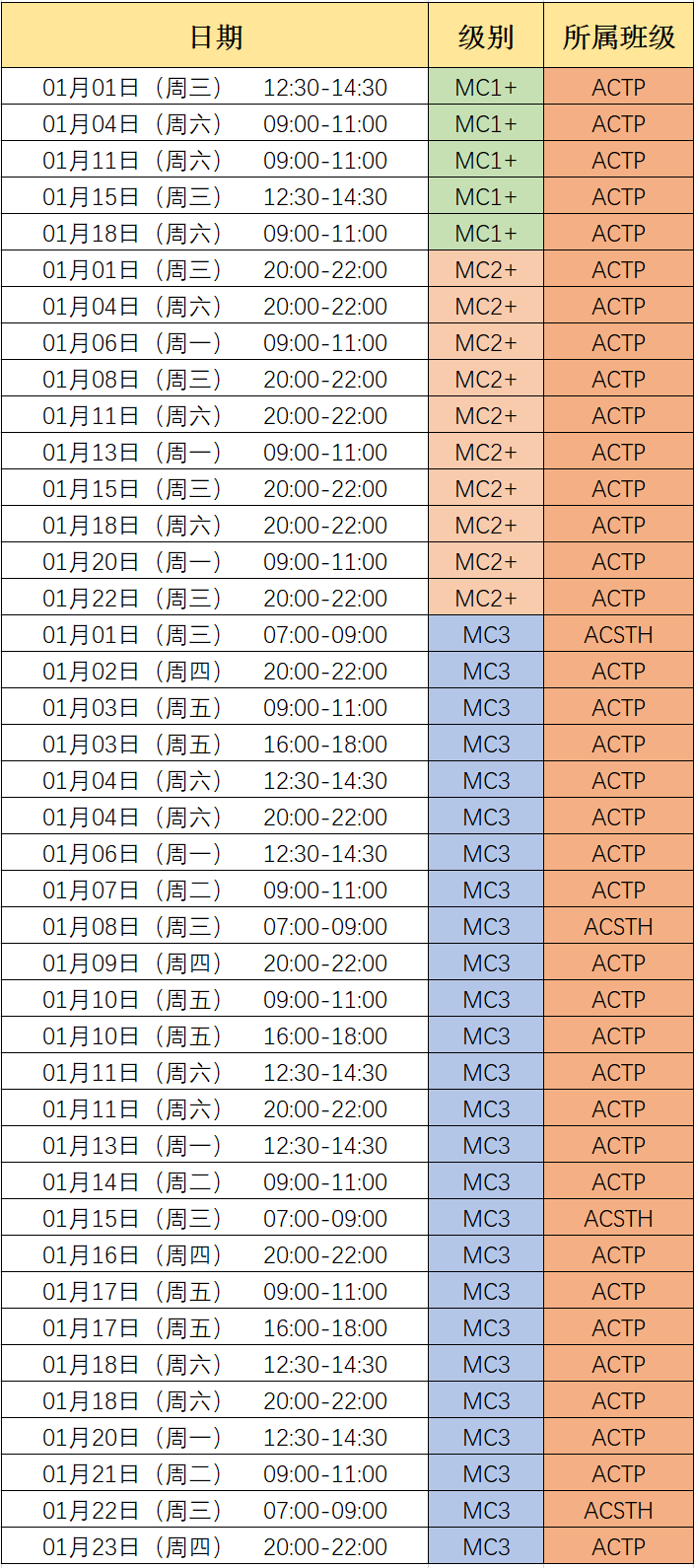 2020年1月MC3及MC(加场)课程时间安排表(ACTP专用