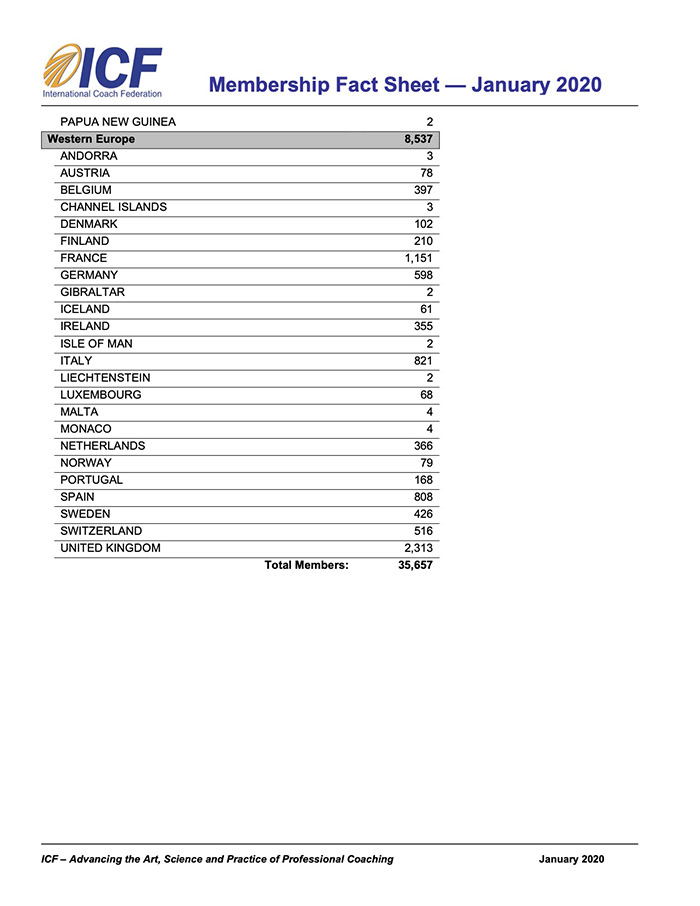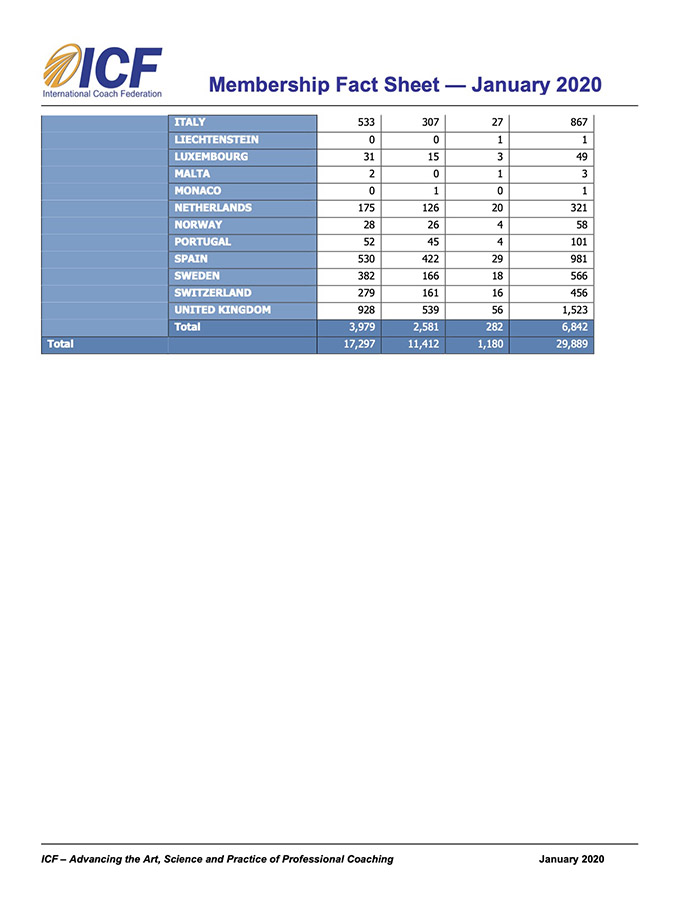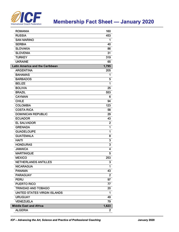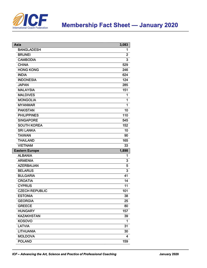 成立于1995,国际教练联合会(ICF)是全球领先的组织,致力于通过制定高标准,提供独立的认证,并建立一个世界范围的证书教练教练网络。ICF寻求推进专业教练的艺术、科学和实践。ICF将教练定义为与客户合作的一个发人深省和创造性的过程,激励他们最大化他们的个人和专业潜力。(以下数据都是截止到发稿日的统计,数量会随着日期的变化而发生变化)