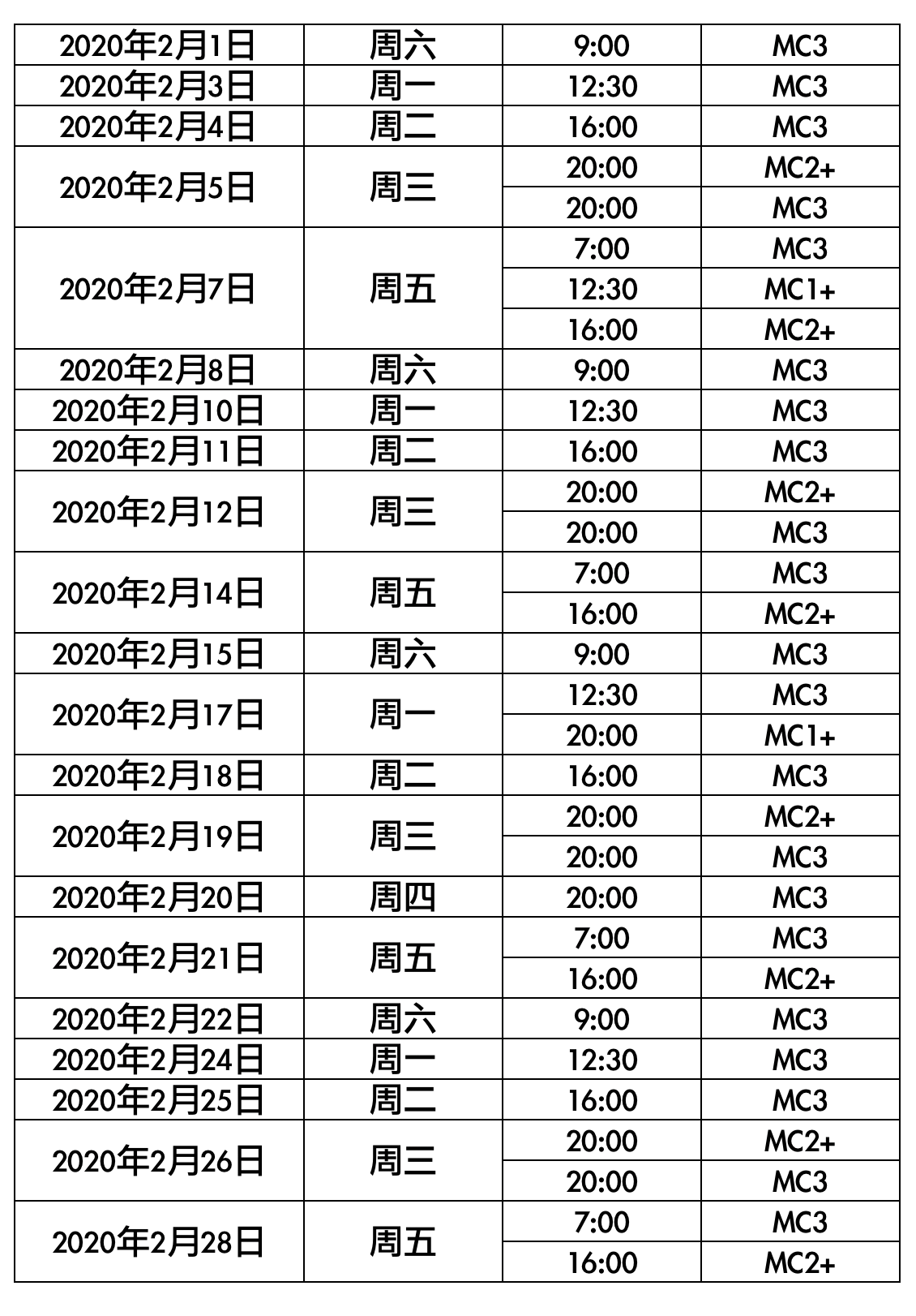 2020年2月MC3及MC(加场)课程时间安排表(ACTP专用)