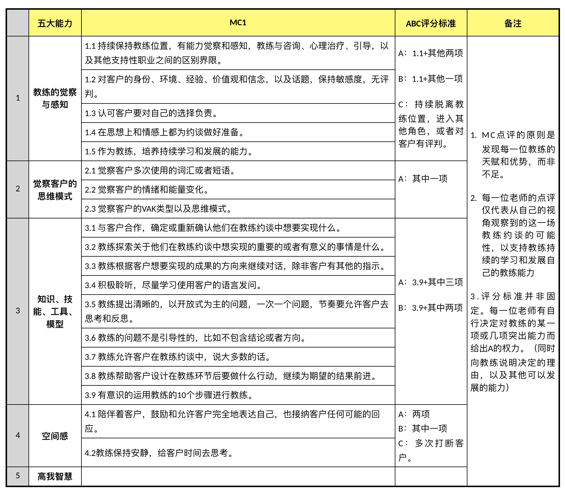 4、本考试标准是在《ICF要求的核心技能》的总结归纳,里面有大量的Coach8所倡导的五大能力。