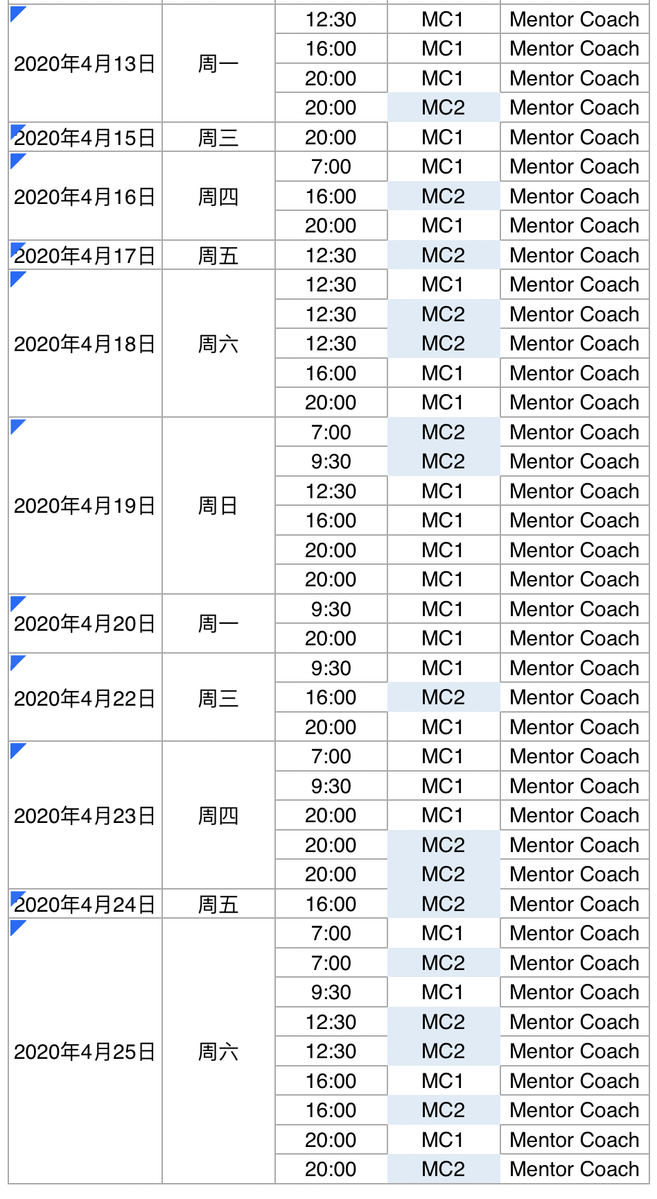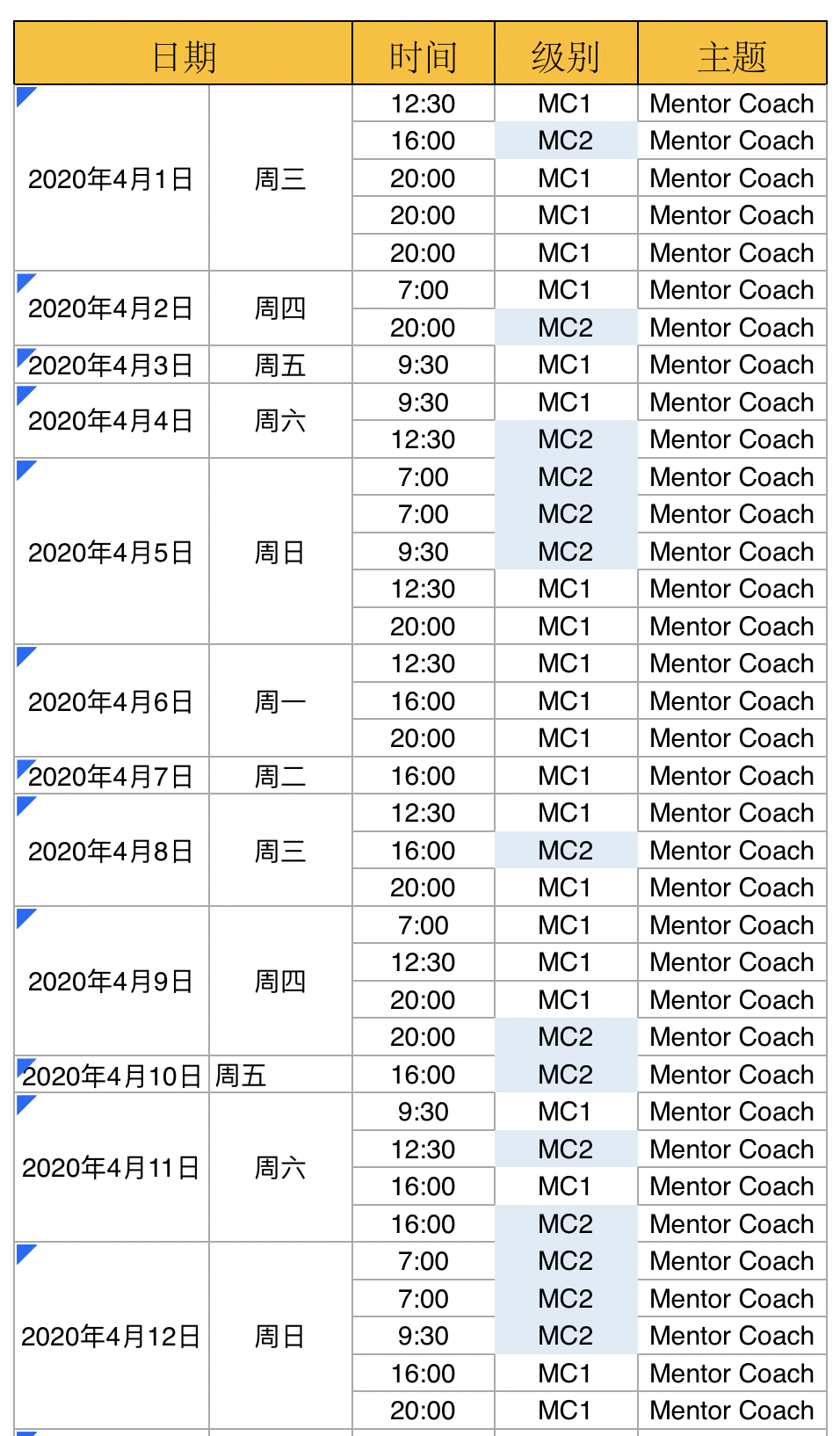 2020年4月MC1、MC2课程时间安排表(ACSTH专用)