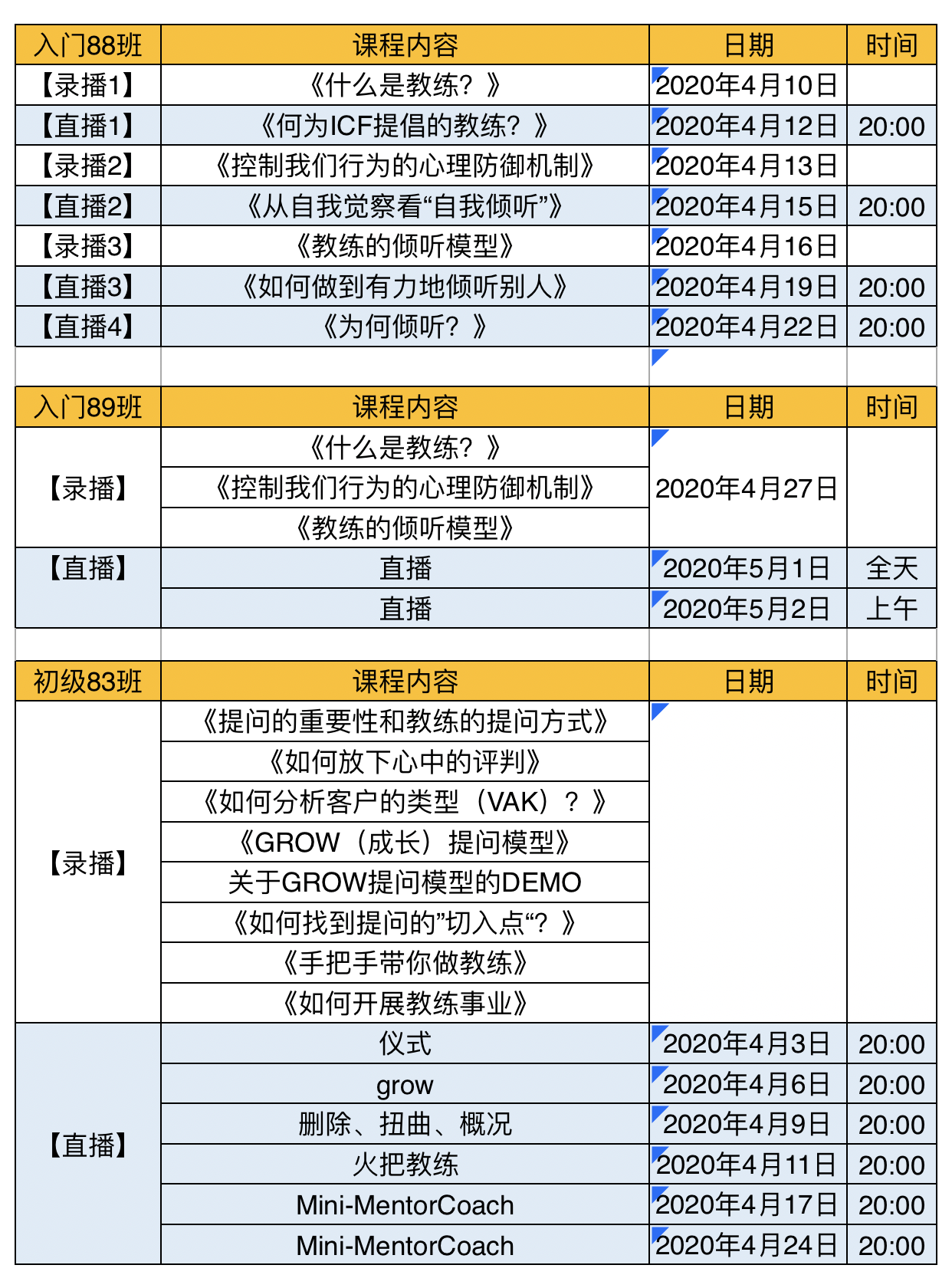 2020年4月入门、初级项目时间安排表