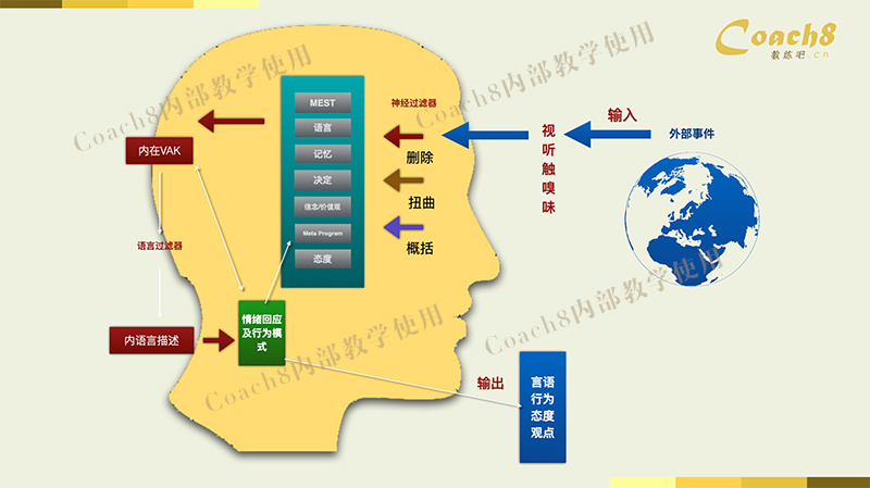 删除扭曲概括这三个概念最早是来自于NLP的创始人们所创立的理论,他们观察和总结了催眠大师埃里克森、萨提亚和波尔(完形疗法的创始人)平时治疗时候与患者之间对话的话术而总结的。一经推出就被广泛的传播和认可,特别是应用在心理治疗、心理咨询、催眠、商业谈判、销售、成功学,而在我们看来这个工具也是一个极为有力的教练工具。透过删除扭曲概括的学习,初学者的教练可以很快的掌握提问的技巧,可以深入的了解客户的内在世界(心智模式),也为更深层的倾听和提问,创造了一个绝佳的把手。