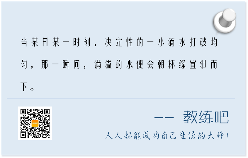 “庸庸碌碌的大半辈子一直像滴落杯中一样,直到滴满杯子,也没有发生任何变化,尽管杯里的水印表面张力已高出杯面。但当某日某一时刻,决定性的一小滴水打破均匀,那一瞬间,满溢的水便朝杯缘宣泄而下。”