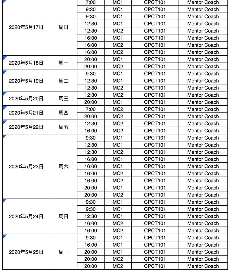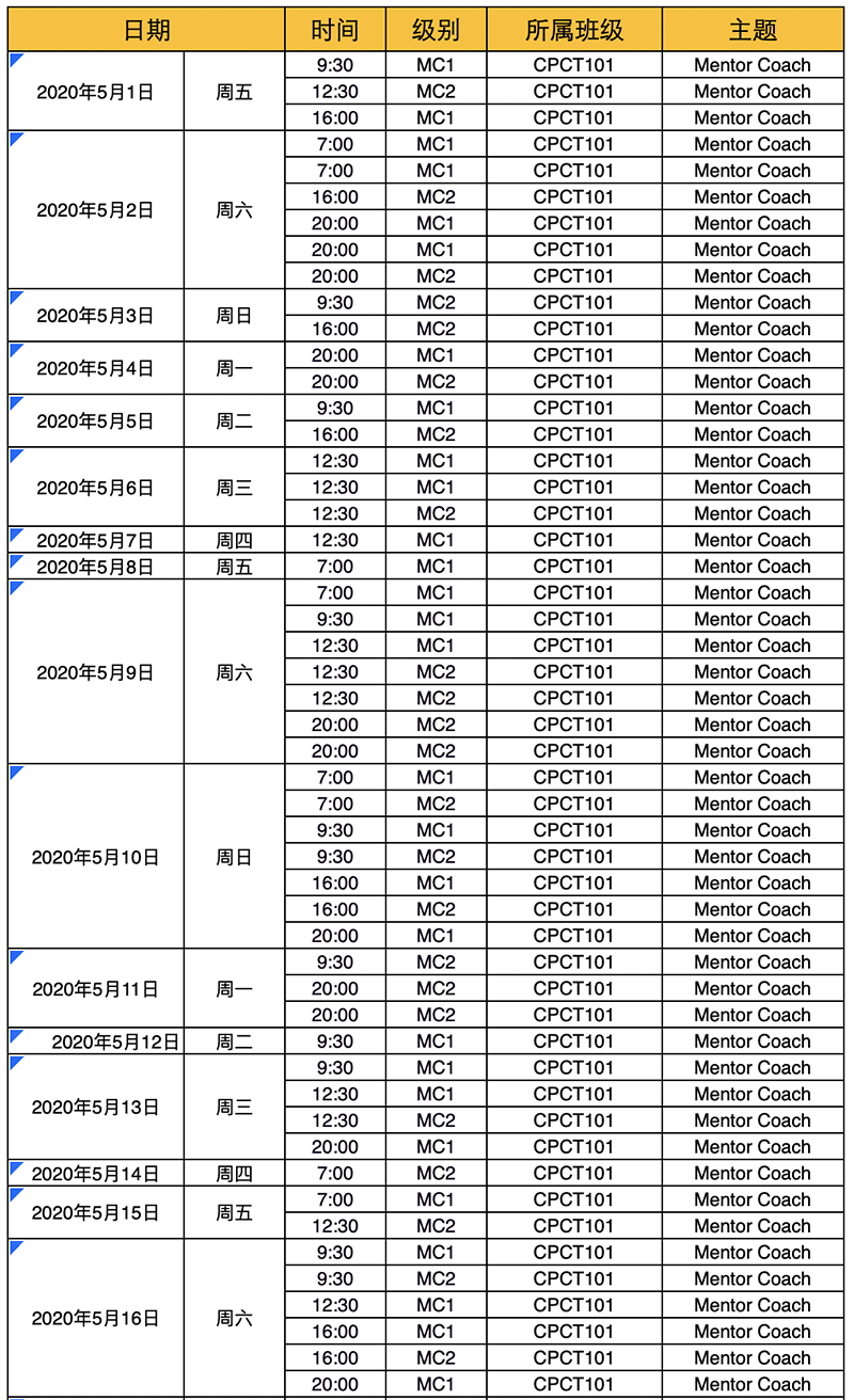 2020年5月MC1、MC2课程时间安排表(CPCT101)