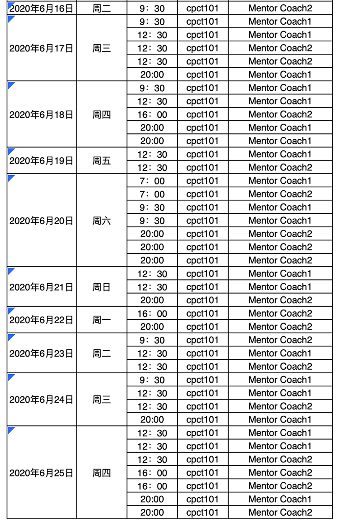 2020年6月MC1、MC2课程时间安排表(CPCT101)