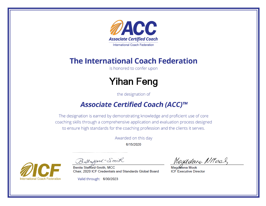 当看见ICF颁发的ACC电子证书时,我觉得这个证书怎么这么好看呢?哈哈,而且老外的签名可真帅,和我的英文名相得益彰,很高大上的感觉。