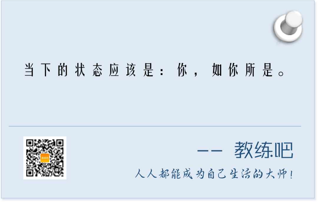 其实,教练讲究的是“being”状态。什么是being状态,玄乎一点叫“临在”、当下,从字面上理解就是:既不是刚才怎么了(been)也不是所以会如何如何(will be)。