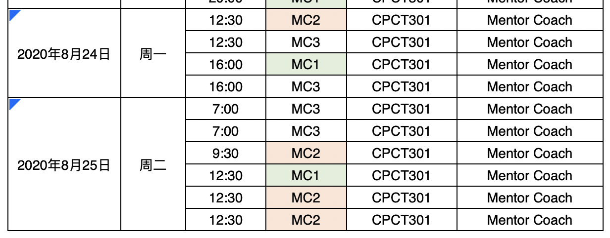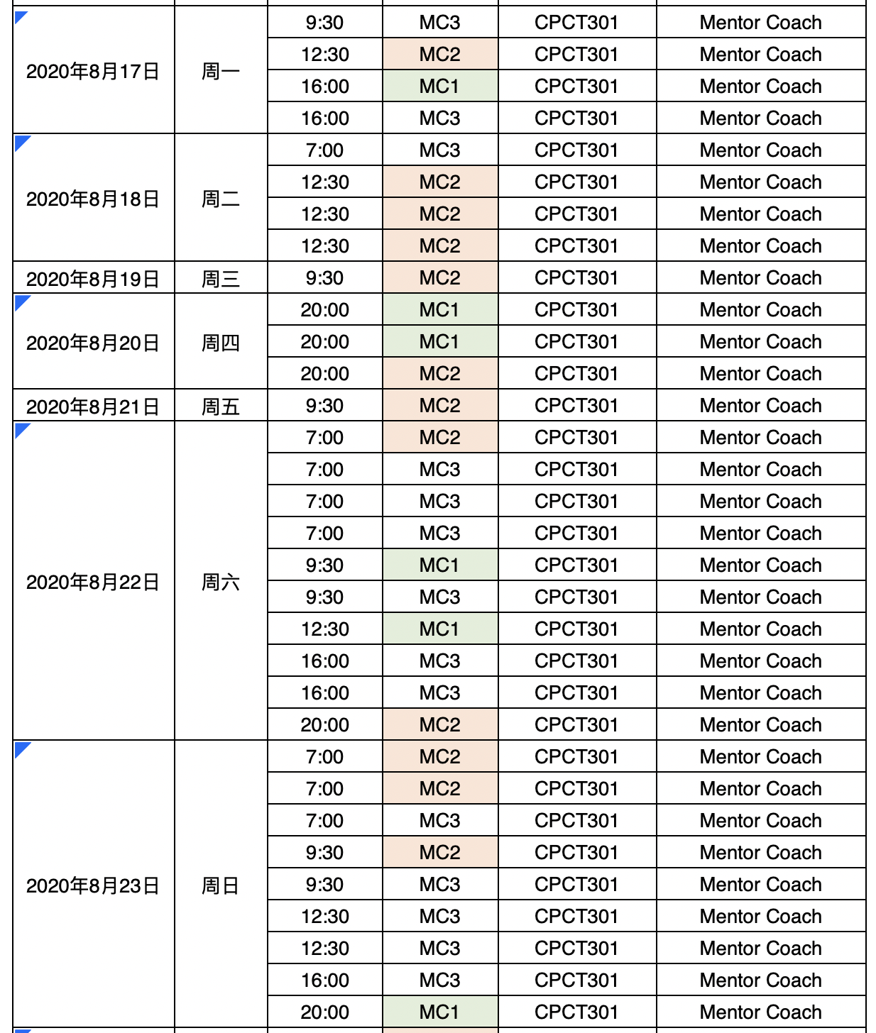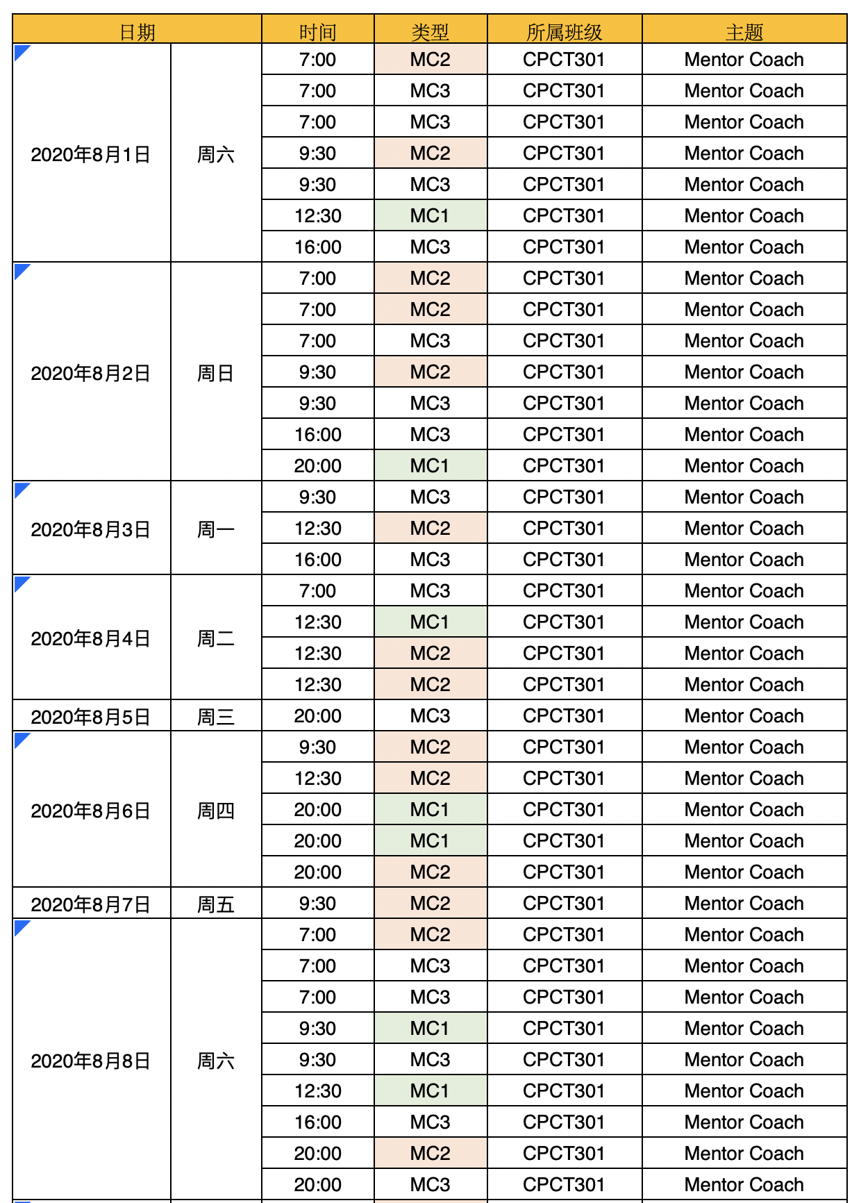2020年8月MC3及MC(加场)课程时间安排表(CPCT301)