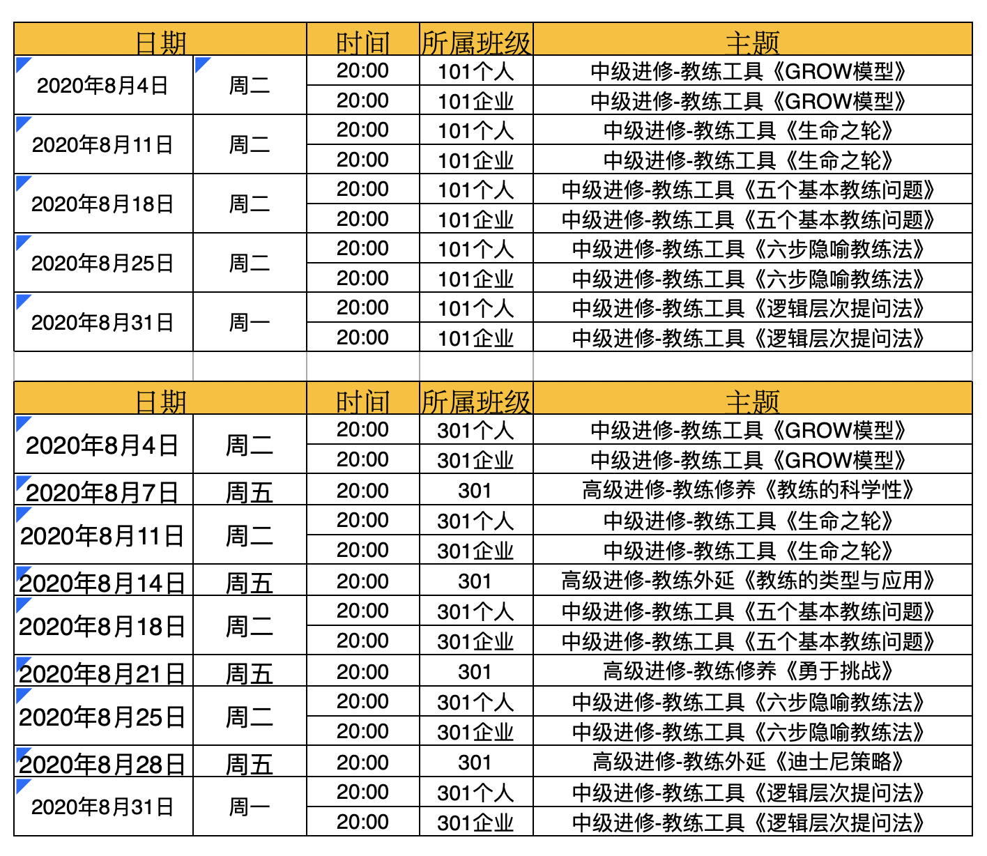 2020年8月主题课程时间安排表