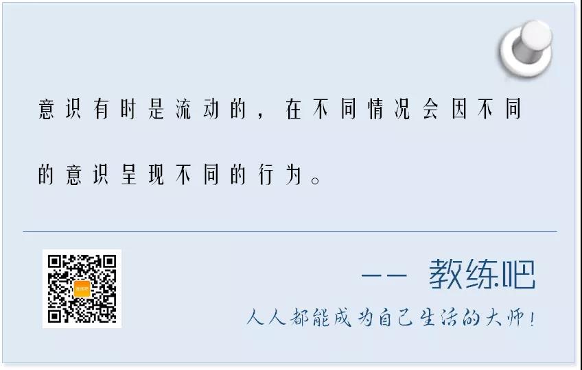 意识有时是流动的,在不同情况会因不同的意识呈现不同的行为。身为教练的我们,当知道这件事时,我们可以更多了解客户当下多状态,用他听的懂的语言和他沟通。