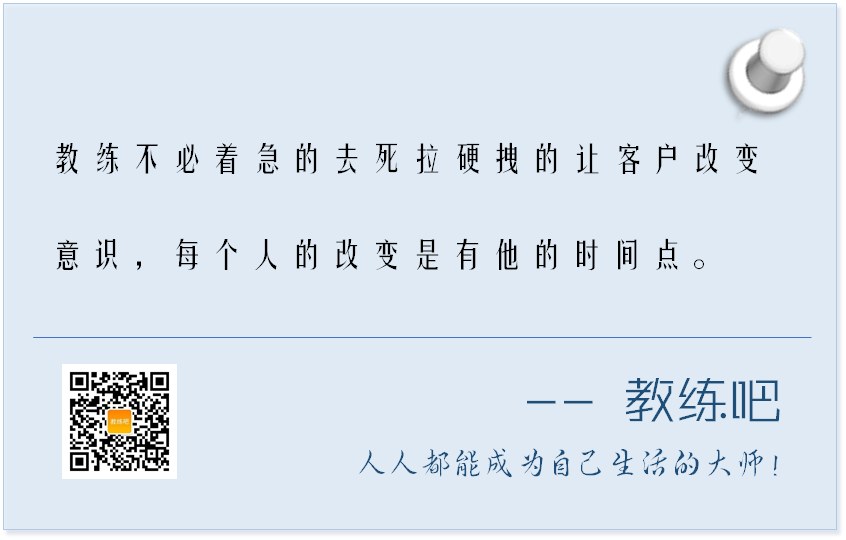 另外,我们不必要着急的去死拉硬拽的让客户改变意识,每个人的改变是有他的时间点。这样当教练比较容易放下执念,同时会有一种顿时的轻松感。