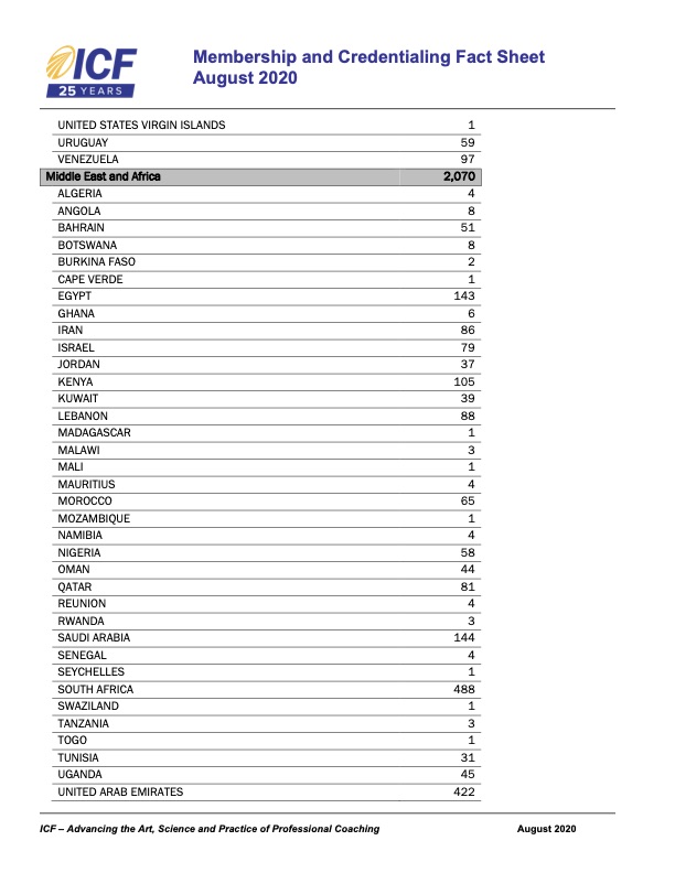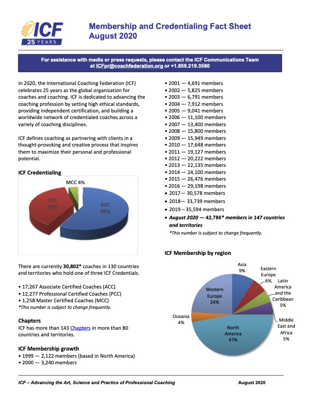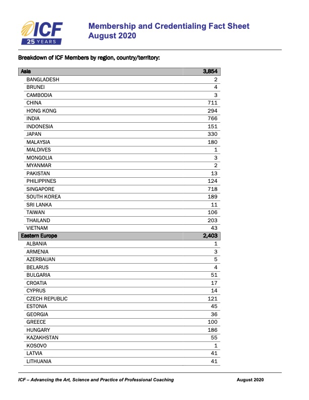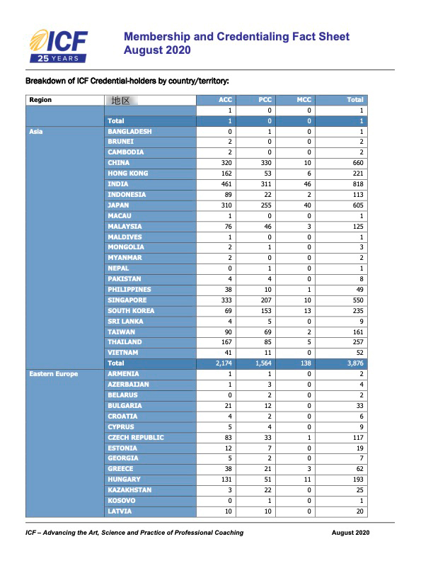 成立于1995,国际教练联合会(ICF)是全球领先的组织,致力于通过制定高标准,提供独立的认证,并建立一个世界范围的证书教练教练网络。ICF寻求推进专业教练的艺术、科学和实践。ICF将教练定义为与客户合作的一个发人深省和创造性的过程,激励他们最大化他们的个人和专业潜力。(以下数据都是截止到发稿日的统计,数量会随着日期的变化而发生变化)