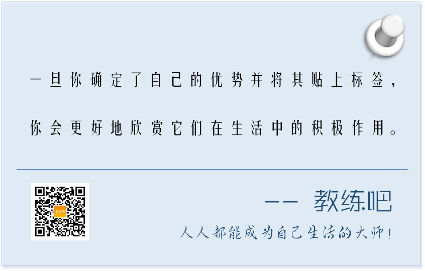 在教练会谈中,关注客户的优势是在哪里展示出来的,客户的优点在他取得的成功中所起的作用,这将加强客户对“我是谁”的理解。 下面这个练习,教练可以带领客户来做,教练本身也可以练习,可以提高对自身优势的认识: