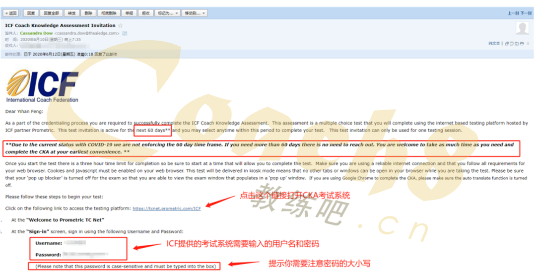 如果你已经通过录音审核那么ICF会第一时间发给你一个CKA笔试通知的邮件,到你在ICF注册的邮箱内,发件人的名称为Cassandra Dow,给你发邮件的人有可能会不一样(同时也要留意邮箱内的垃圾箱)。