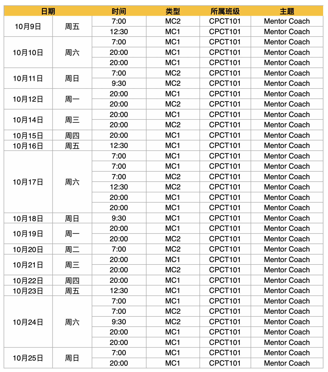 2020年10月MC1、MC2课程时间安排表(CPCT101)