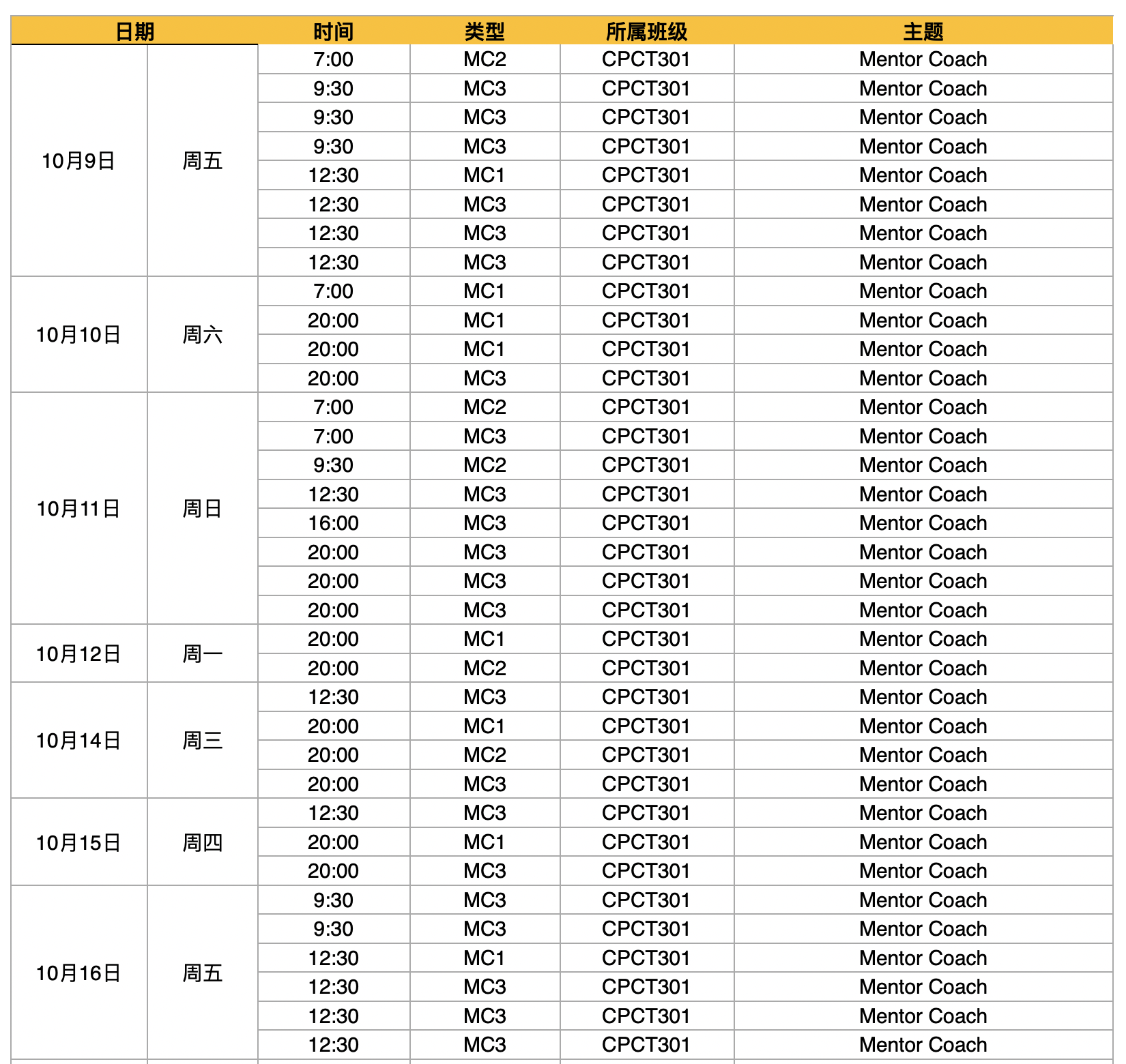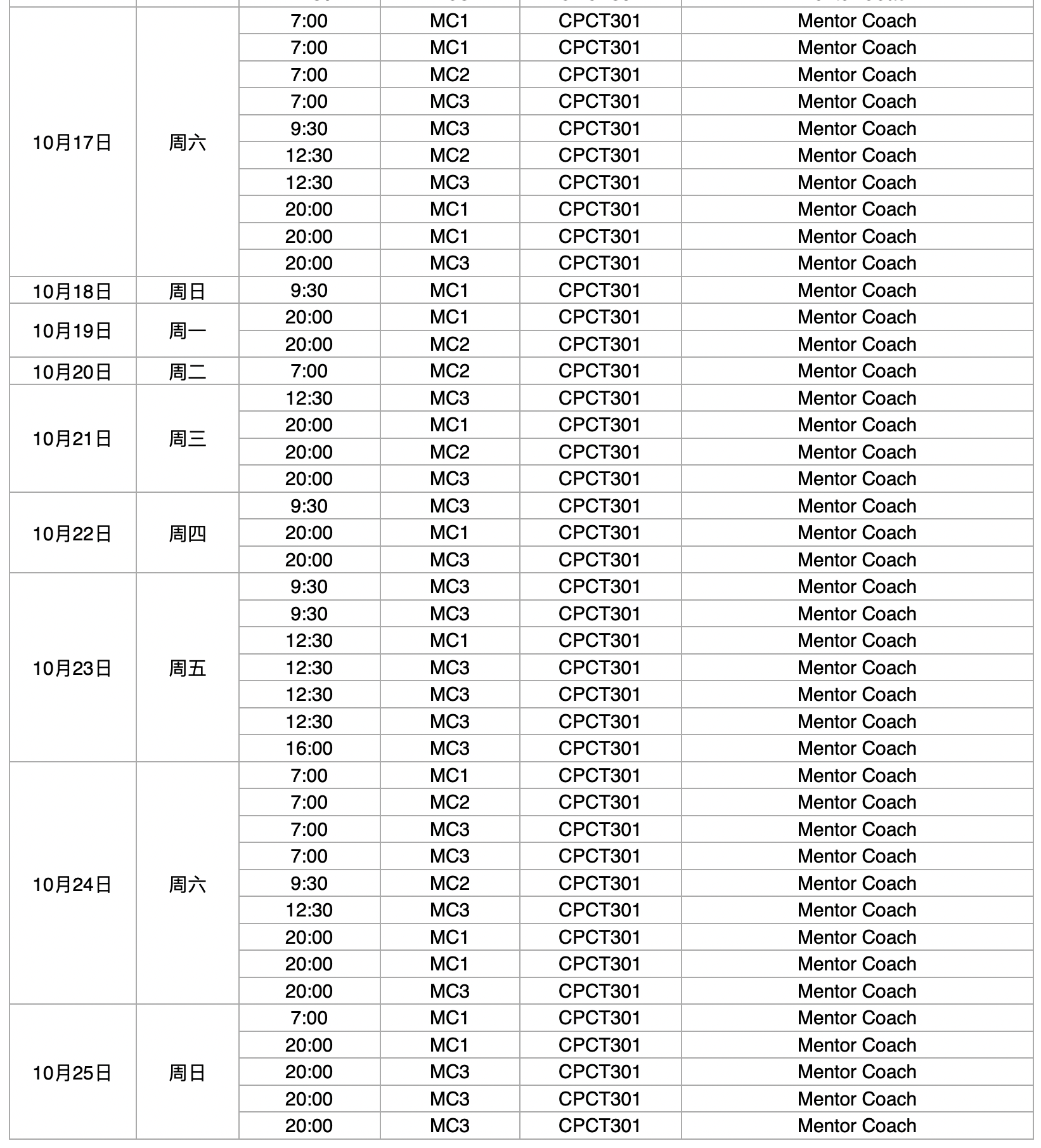 2020年10月MC3及MC(加场)课程时间安排表(CPCT301)