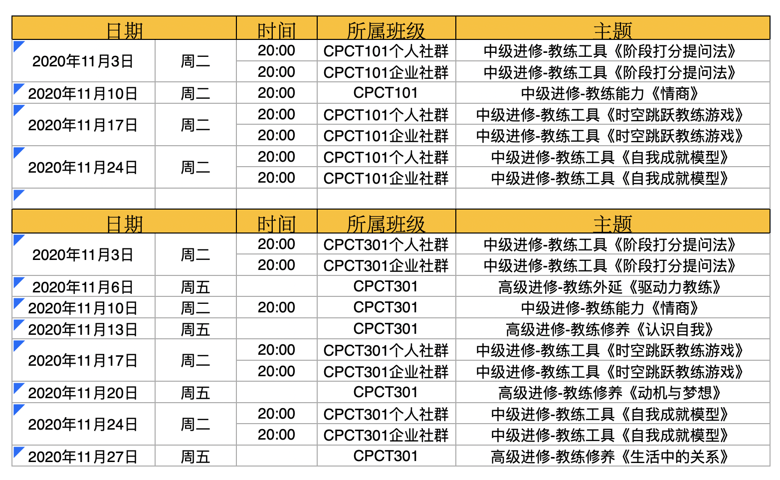 2020年11月主题课程时间安排表
