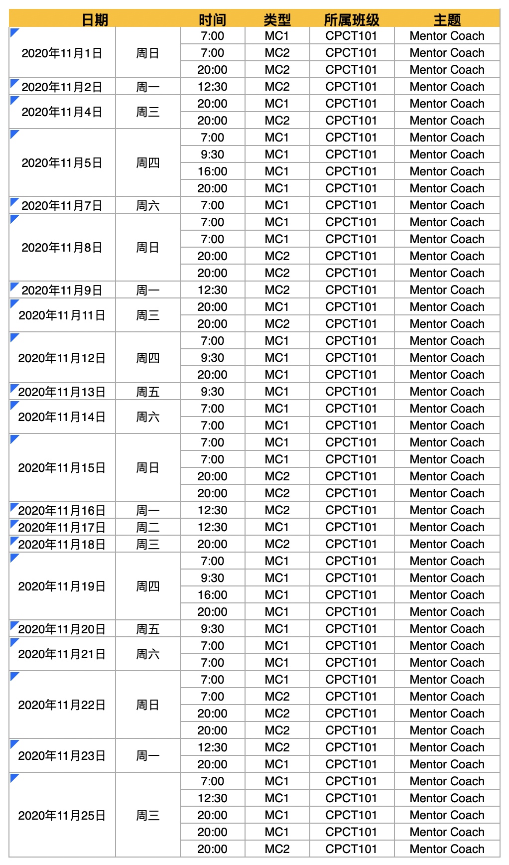 2020年11月MC1、MC2课程时间安排表(CPCT101)
