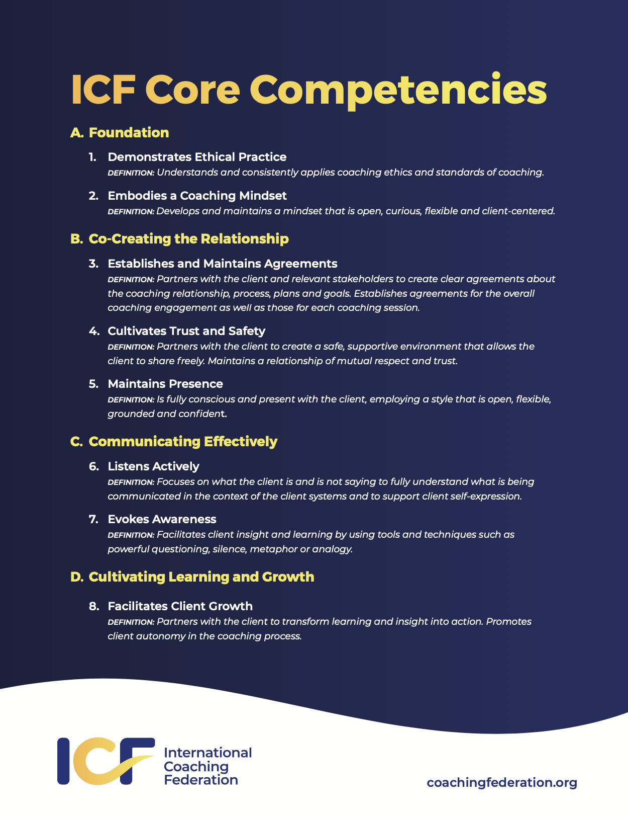Following a rigorous, 24-month coaching practice analysis, the International Coach Federation is announcing an updated ICF Coaching Core Competency Model. This competency model is based on evidence collected from more than 1,300 coaches across the world, including both ICF Members and non-members and representing a diverse range of coaching disciplines, training backgrounds, coaching styles and experience levels. This large-scale research initiative validated that much of the existing ICF Core Competency Model, developed nearly 25 years ago, remains critically important to the practice of coaching today. Some new elements and themes that emerged from the data have also been integrated into the model. These include a paramount emphasis on ethical behavior and confidentiality, the importance of a coaching mindset and ongoing reflective practice, the critical distinctions between various levels of coaching agreements, the criticality of partnership between coach and client, and the importance of cultural, systemic and contextual awareness. These foundational components, combined with emerging themes, reflect the key elements of coaching practice today and will serve as stronger, more comprehensive coaching standards for the future.